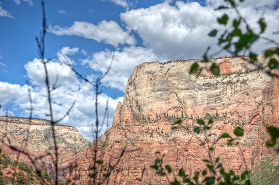 While in Las Vegas this summer me, Melissa and some friends rented a car and drove out to Zion National Park in Utah.  While walking some of the trails I caught this amazing view behind some leaves.  This photo is one of my favorites from Zion as it shows just how colorful the park is.  There are multiple colors of rocks and the green trees and land colors are so vibrant.